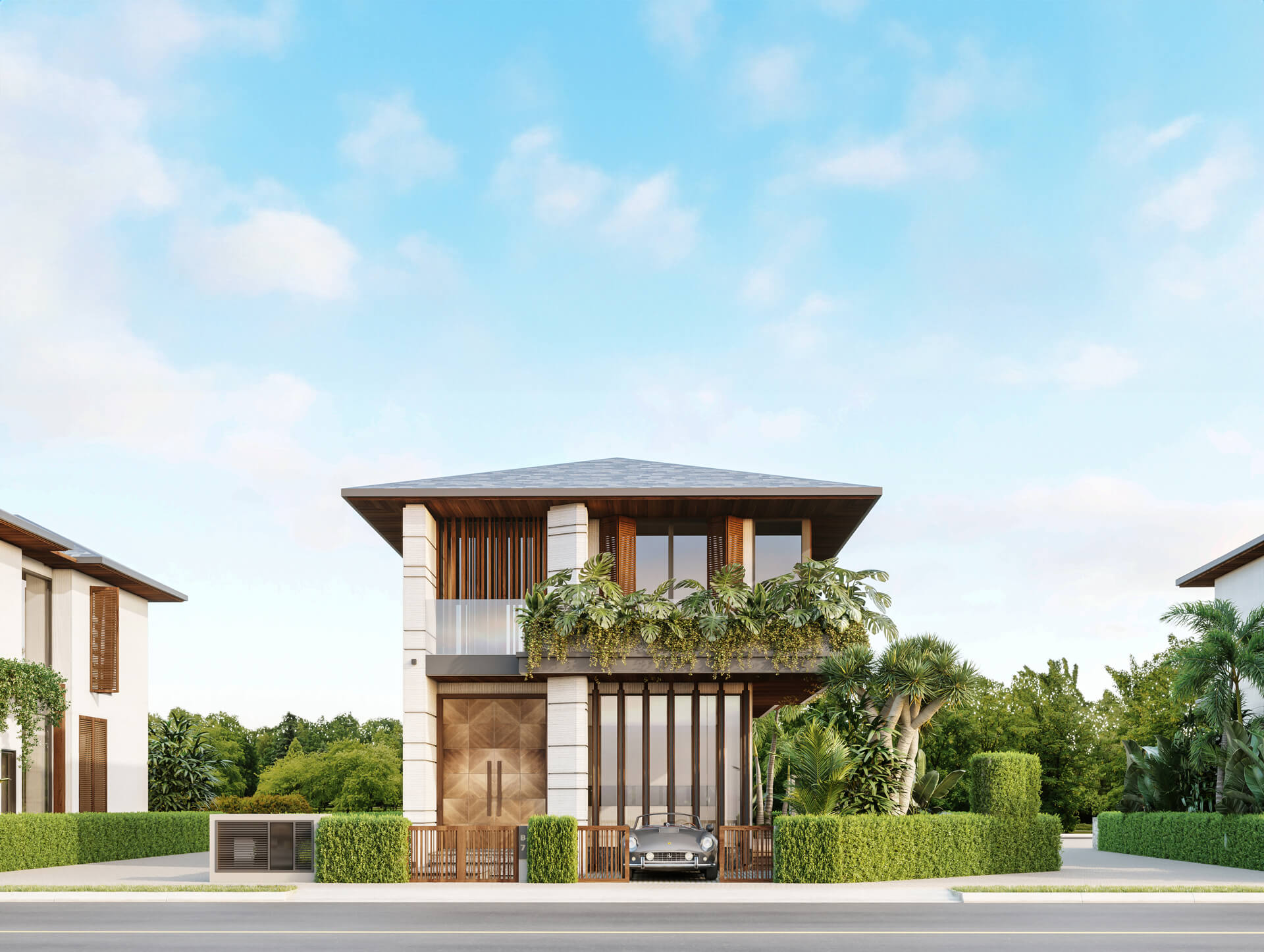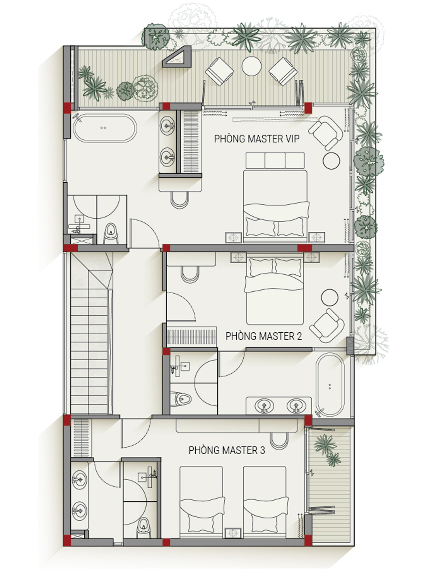 Cầu thang bay thanh thoát dẫn lối lên tầng hai, vừa mang tính thẩm mỹ, vừa tận dụng ánh sáng tự nhiên tạo cảm giác thông thoáng. Tầng hai là nơi nghỉ ngơi yên bình với ba phòng ngủ rộng rãi, mỗi phòng đều có nhà vệ sinh riêng khép kín. Phòng ngủ chính với ban công rộng rãi, hướng thẳng ra cảnh vườn xanh ngát. Đây là nơi bạn có thể thư giãn, uống một tách trà và ngắm nhìn khung cảnh thiên nhiên yên bình mỗi buổi sáng.