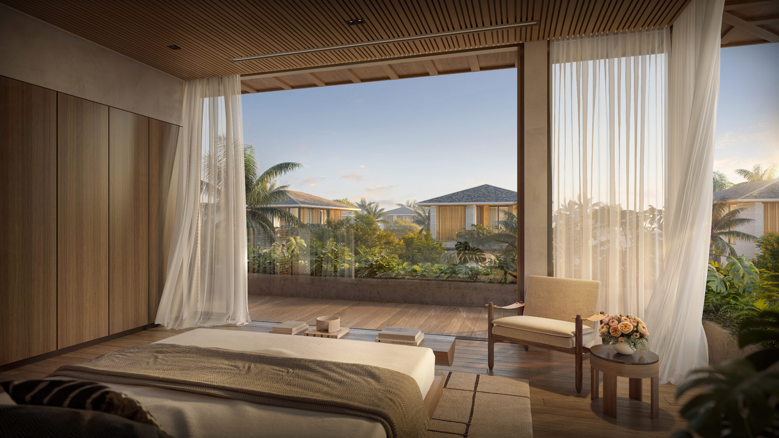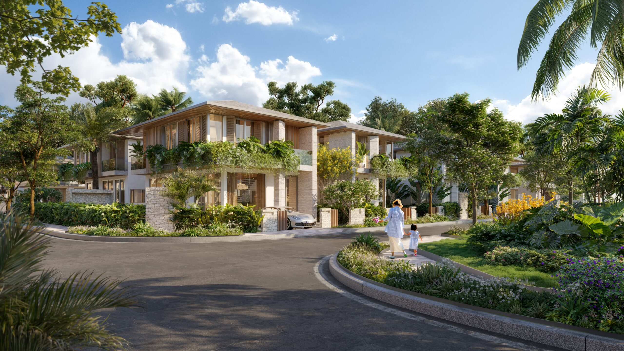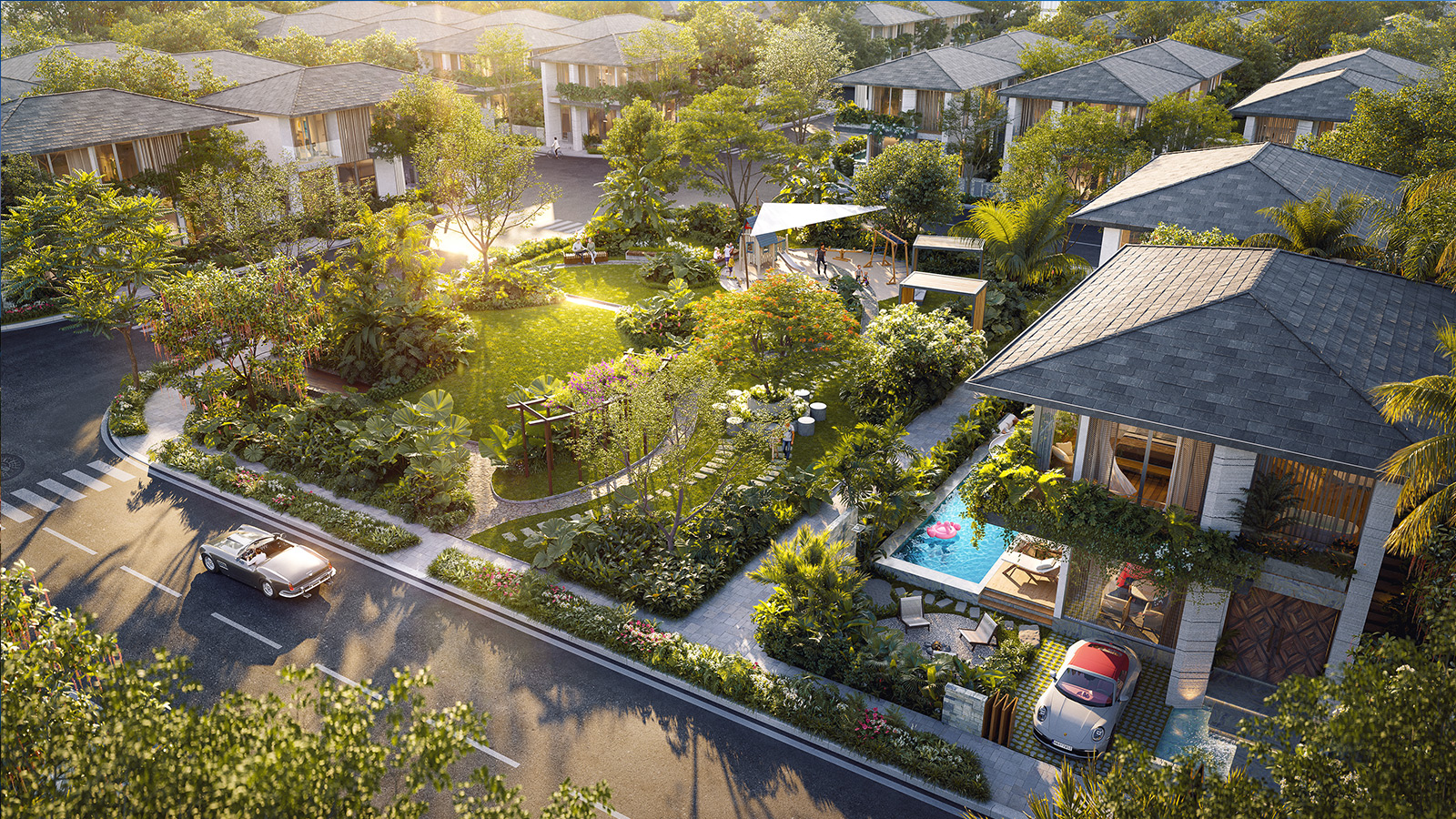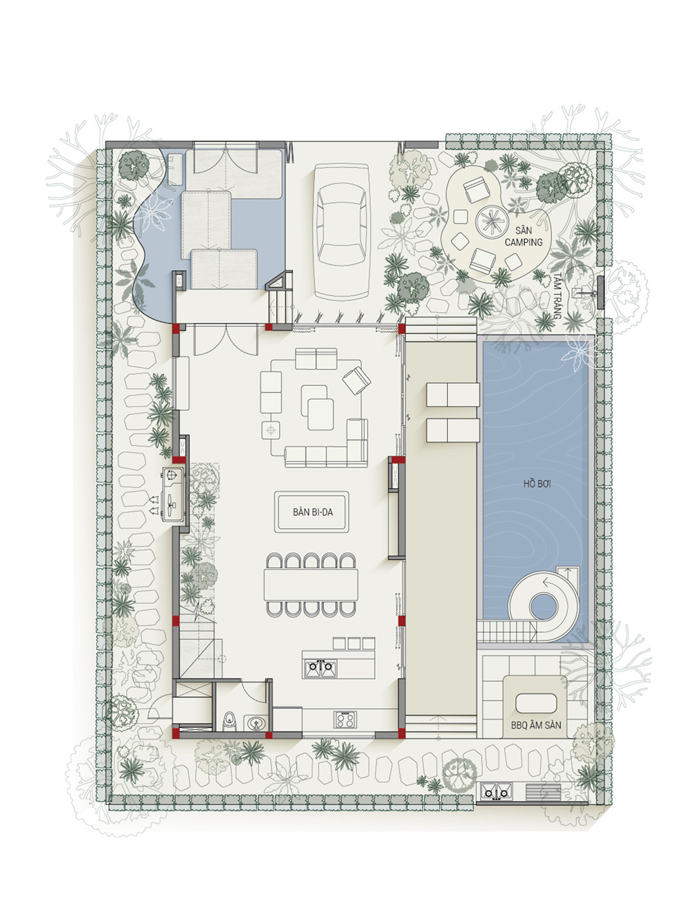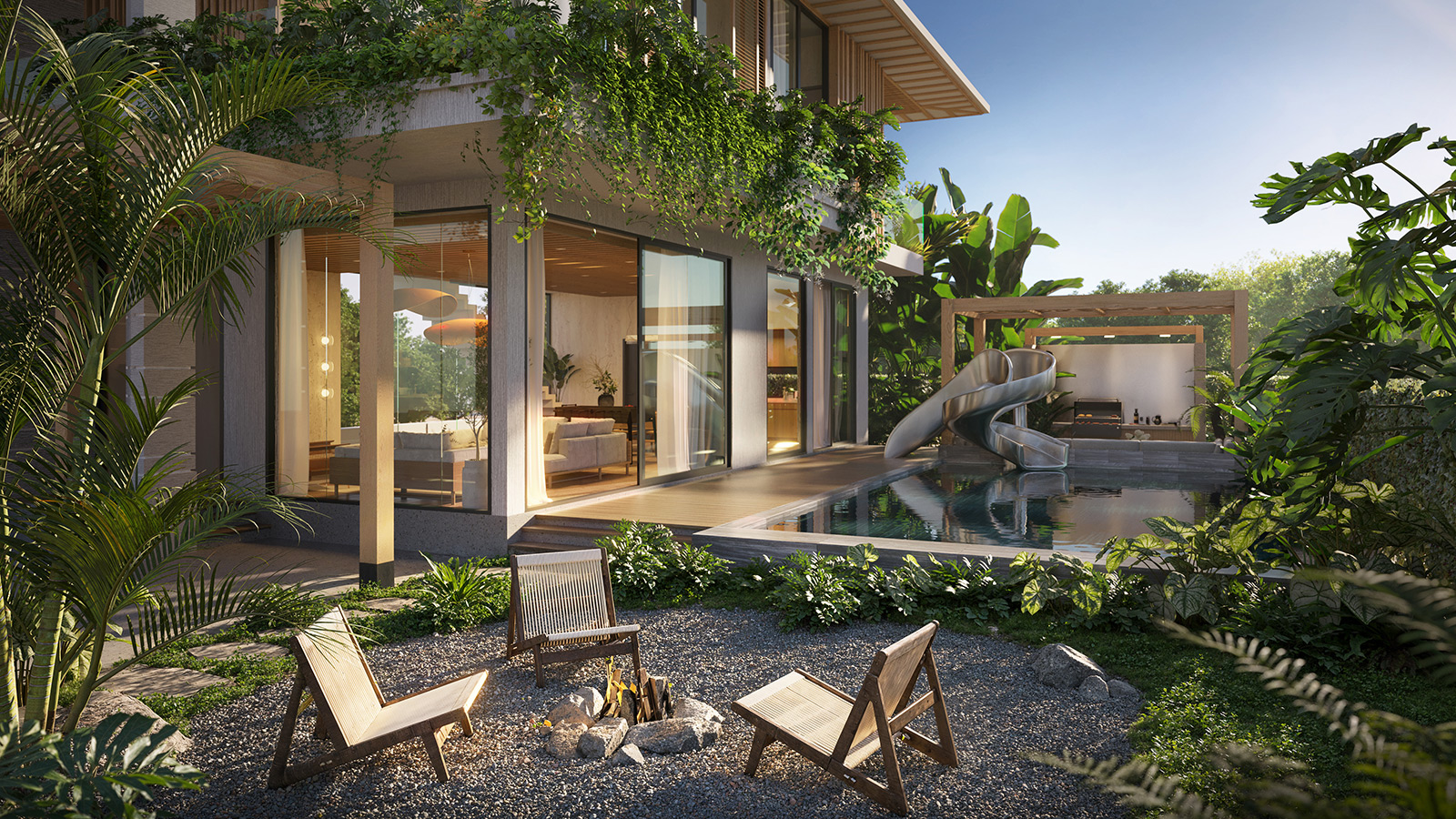 Tầng một với không gian mở, nơi phòng khách, bếp và khu sinh hoạt chung được kết nối liền mạch, mở ra các góc sinh hoạt linh hoạt cho gia đình trẻ và nhóm bạn. Khu vườn ngoài trời với nhiều tầng cây xanh tạo nên không gian thoáng đãng và thoải mái. Đặc biệt với khu vực lửa trại ấm cúng cho những buổi tối quây quần; bên cạnh là góc BBQ âm sàn hiện đại cùng hồ bơi riêng có cầu trượt. Tất cả tạo nên một không gian hoàn hảo cho những buổi tụ họp thân mật, từ tiệc tối ấm áp đến pool party vui nhộn.